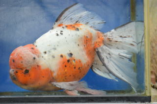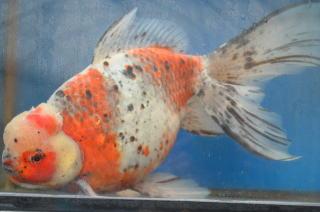 | ジャンボ東錦とは ジャンボ獅子頭の、素赤と更紗に黒(なぜか黄色い個体の出現は、ごく稀になっていました)だけでなくもっといろいろな色合い、模様のジャンボ獅子頭が出来れば、楽しみの幅が広がるのにと考え、まず東錦の柄を作ってみようと思いました。 平成6年弥富産らしい東錦数尾を手にいれ、親になった島木さん譲りのジャンボ獅子頭の雌親に東錦の雄をかけ,またジャンボ獅子頭の雄を東錦の雌にかける事により得られた仔の中からキャリコ柄のもののみを残しました。 以後それら同士の交配を繰り返し、平成12〜14年に2回の雄の東錦の戻し交配を行い出来た子をジャンボ東錦と名付けました。(ジャンボ東錦は、巻木養魚場で最初に創りました) |